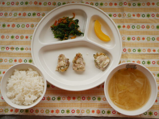 ~ 今日の給食 ~ ・鶏肉の青のり焼き ・ほうれん草の白和え ・ごはん ・キャベツとえのきのみそ汁 ・もも ~ 今日のおやつ ~ ・牛乳 ・ポテトフライ