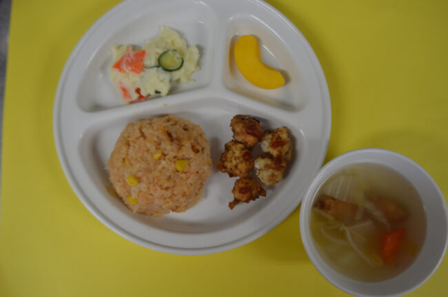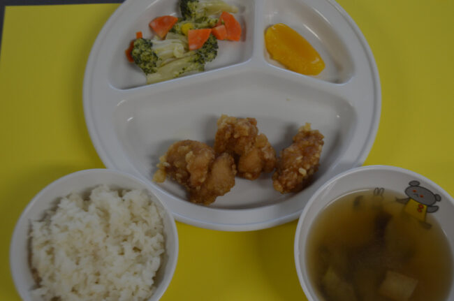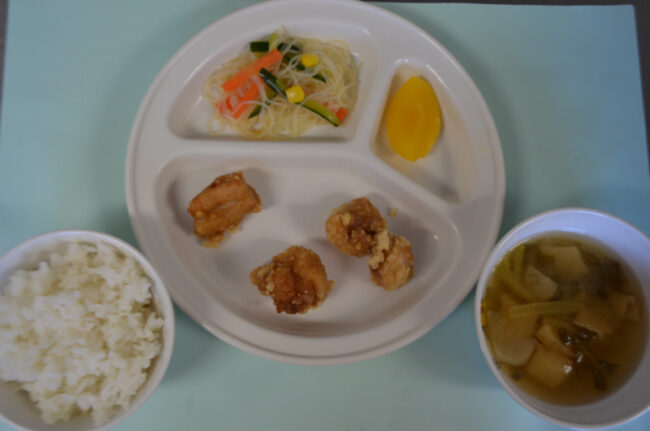 ~今日の給食~ ・鶏のから揚げ ・ブロッコリーとコーンのあえもの ・ごはん ・なすと油揚げのみそ汁 ・もも ~今日のおやつ~ ・牛乳 ・彩りそうめん