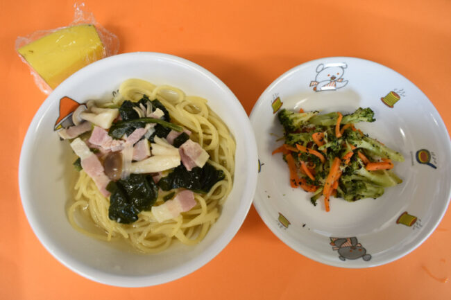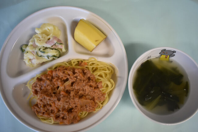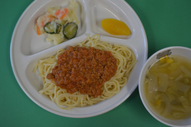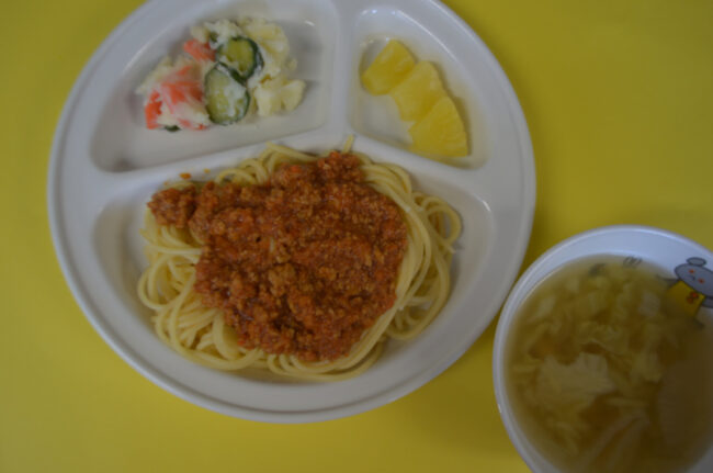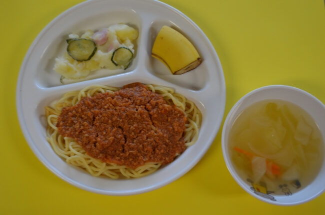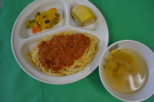 ~今日の給食~ ・なすのミートスパゲティー ・ブロッコリーとコーンのあえもの ・野菜のスープ ・バナナ ~今日のおやつ~ ・わかめおにぎり ・牛乳