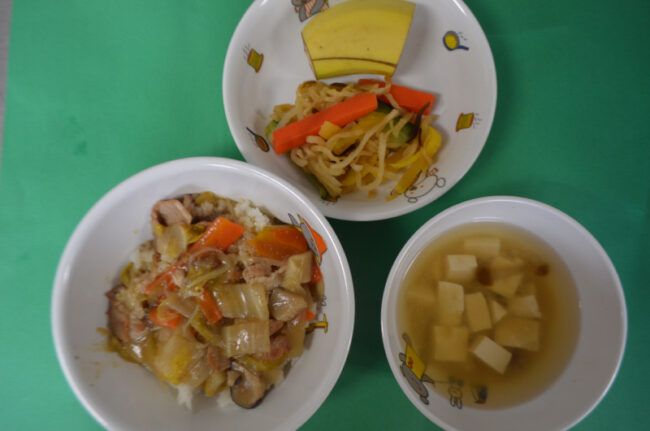 ~今日の給食~ ・カレー風野菜炒め ・ちくわときゅうりのあえもの ・ごはん ・豆腐となめこのみそ汁 ・もも ~今日のおやつ~ ・牛乳 ・ぶどうゼリー ・ビスケット