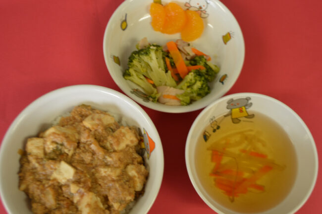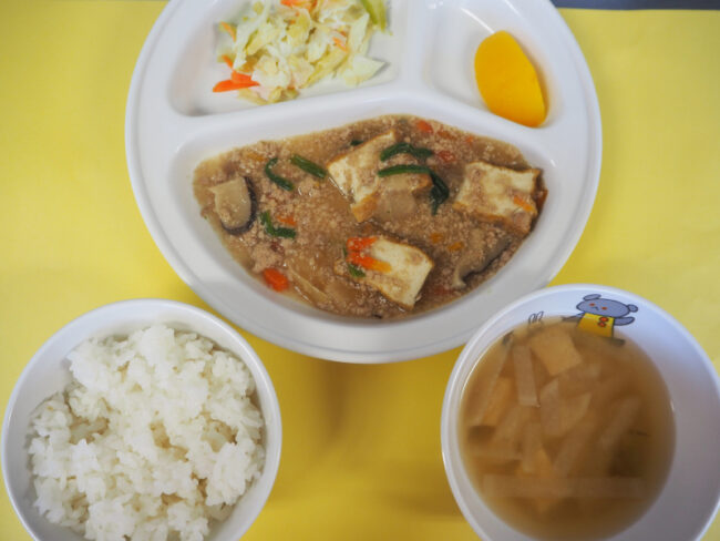 ~ 今日の給食 ~ ・ポークビーンズ ・ツナサラダ ・ごはん ・豆腐と油揚げのみそ汁 ・パイン ~ 今日のおやつ ~ ・牛乳 ・もちもちドーナツ