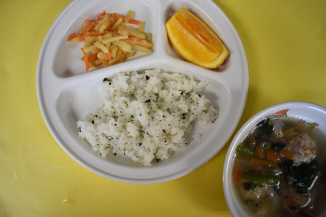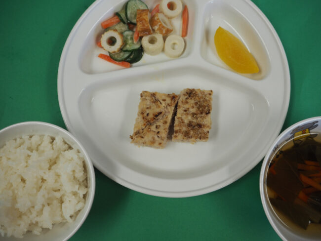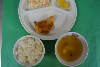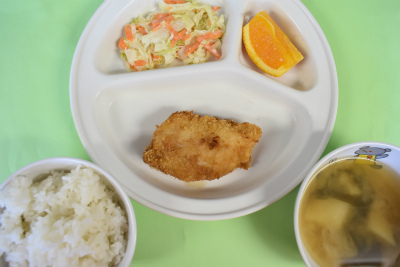 ~今日の給食~ ・カレイのフライ ・キャベツのゆかりあえ ・ごはん ・ほうれん草ともやしのみそ汁 ・オレンジ ~今日のおやつ~ ・牛乳 ・彩りそうめん
