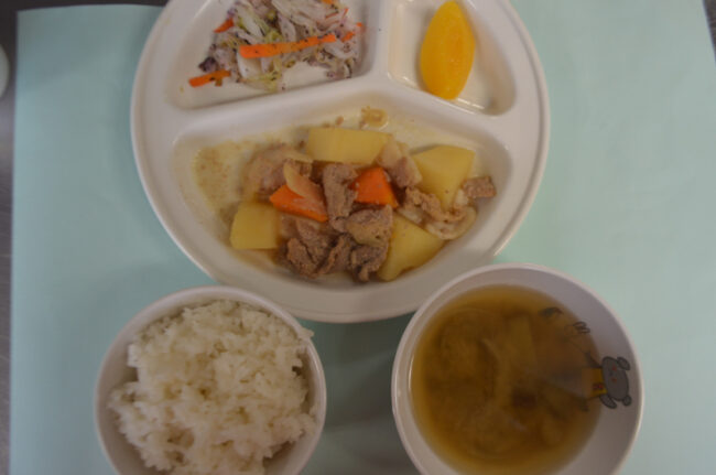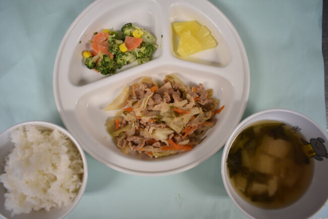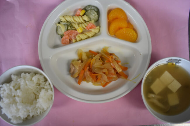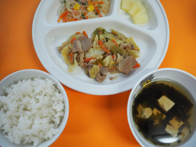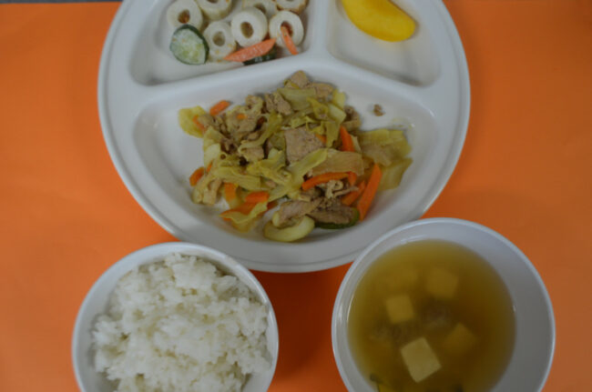 ~今日の給食~ ・肉野菜炒め ・ちくわときゅうりのあえもの ・ごはん ・じゃがいもと玉ねぎのみそ汁 ~今日のおやつ~ ・牛乳 ・マシュマロコーンフレーク
