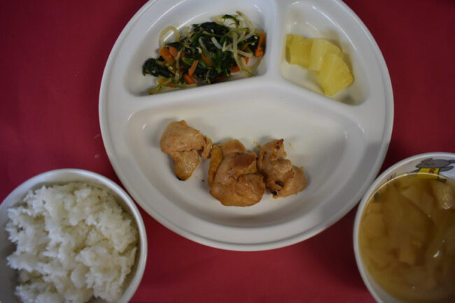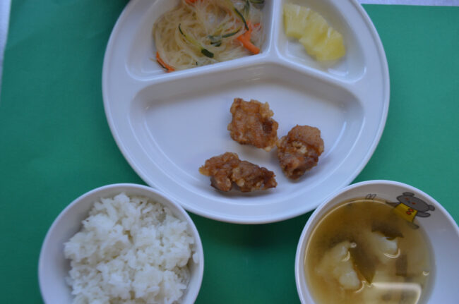~本日の給食~ ・カレー風鶏のから揚げ ・キャベツのゆかりあえ ・ごはん ・小松菜と人参のみそ汁 ・パイン ~今日のおやつ~ ・麦茶 ・お誕生日ケーキ