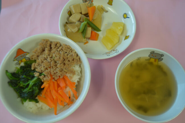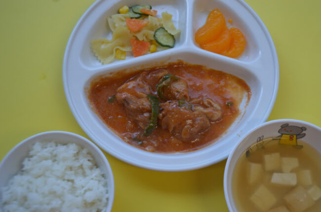 ~今日の給食~ ・切り干し大根のハンバーグ ・スパゲティーサラダ ・小松菜と油揚げのみそ汁 ・ごはん ・もも ~今日のおやつ~ ・牛乳 ・とうもろこしパンケーキ(いちご組・もも組完了)