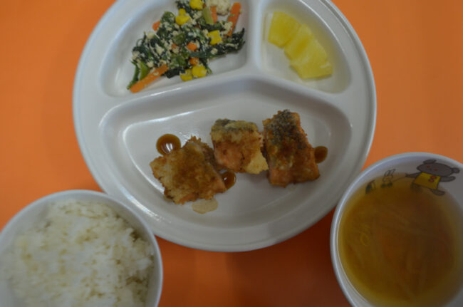 ~今日の給食~ ・鮭のフライ ・ほうれん草の白和え ・ごはん ・もやしと人参のみそ汁 ・パイン ~今日のおやつ~ ・牛乳 ・りんごゼリー ・鉄ウエハース