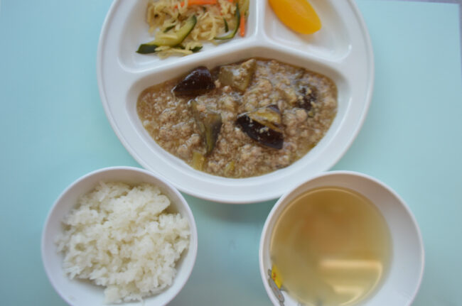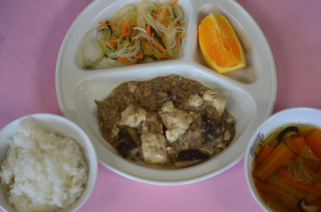 ~ 今日の給食 ~ ・なすのひき肉あんかけ ・切り干し大根のサラダ ・ごはん ・中華スープ ・もも ~ 今日のおやつ ~ ・牛乳 ・あじさいゼリー ・甘辛せんべい