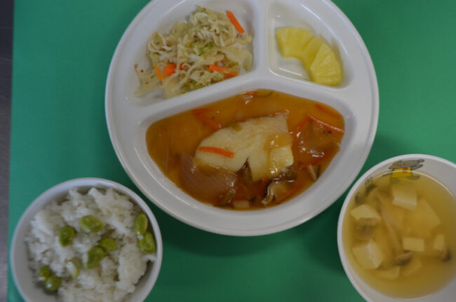 ~今日の給食~ ・白身魚のあんかけ ・キャベツのごまあえ ・枝豆ごはん ・豆腐としめじのみそ汁 ・パイン ~今日のおやつ~ ・牛乳 ・パンケーキ