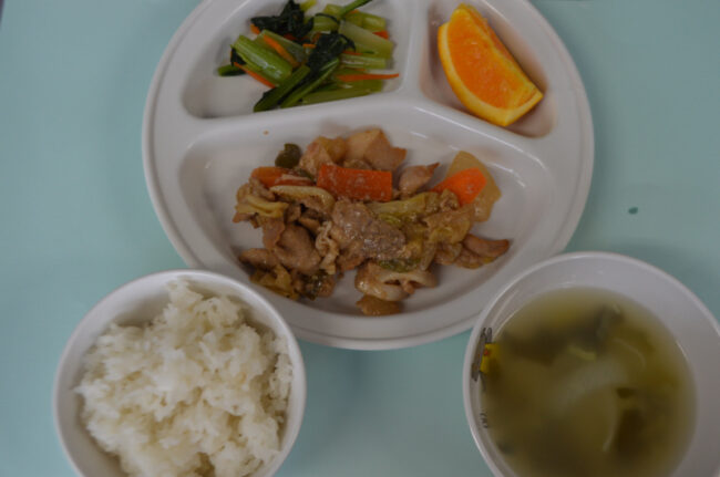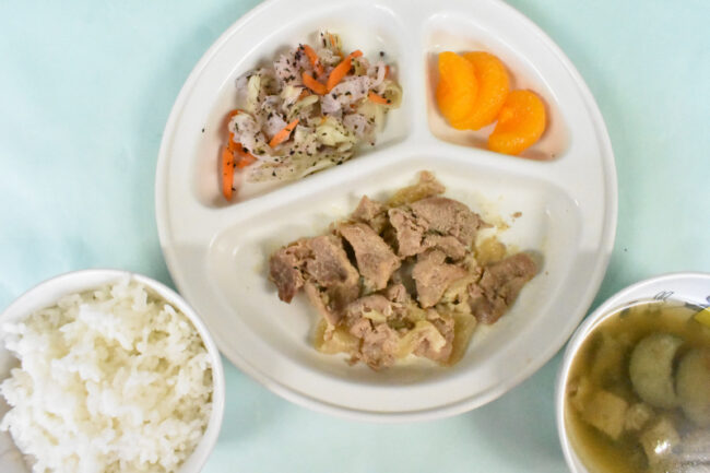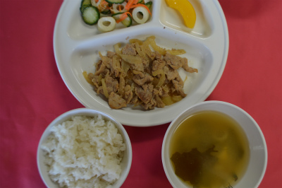 ~ 今日の給食 ~ ・豚肉の生姜焼き ・キャベツのゆかり和え ・ごはん ・もやしと人参のみそ汁 ・みかん ~ 今日のおやつ ~ ・牛乳 ・パンケーキ