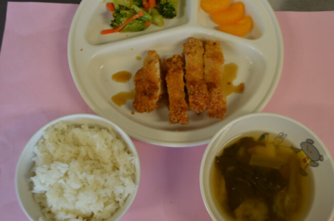 ~ 今日の給食 ~ ・チキンカツ ・ブロッコリーと人参のごま和え ・ごはん ・お麩とほうれん草のみそ汁 ・みかん ~ 今日のおやつ ~ ・牛乳 ・かぼちゃの茶巾 &…