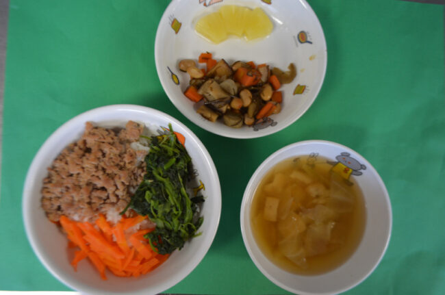 ~今日の給食~ ・松かさ焼き ・ほうれん草と人参のおかかあえ ・ごはん ・キャベツとしめじのすまし汁 ・もも ~今日のおやつ~ ・牛乳 ・ドーナツ