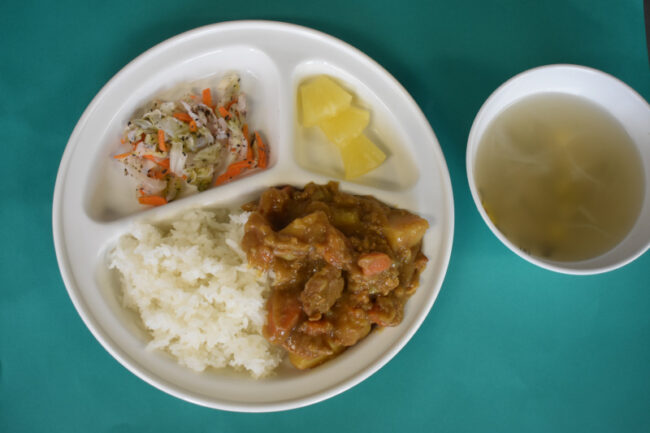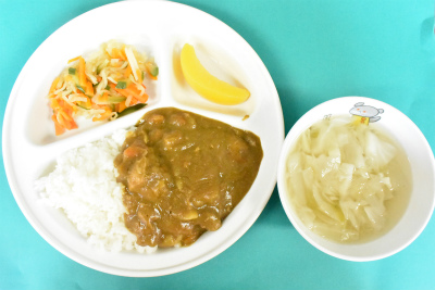 ~ 今日の給食 ~ ・チキンカレーライス ・切り干し大根のサラダ ・キャベツとたまねぎのスープ ・もも ~ 今日のおやつ ~ ・牛乳 ・きな粉お麩ラスク