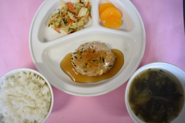 ~今日の給食~ ・ひじきの和風ハンバーグ ・キャベツと人参の昆布和え ・ほうれん草ともやしのみそ汁 ・みかん ~今日のおやつ~ ・牛乳 ・スティックパン
