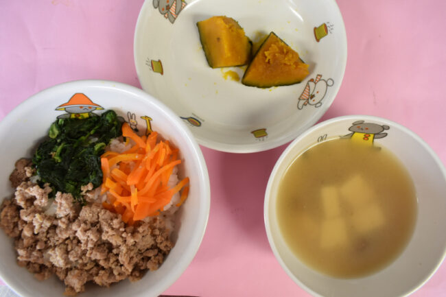 ~今日の給食~ ・ビビンバ丼 ・ブロッコリーと人参のごまあえ ・冷やしトマト ・豆腐とわかめのみそ汁 ・パイン ~今日のおやつ~ ・牛乳 ・ひまわりゼリー ・甘辛せんべい