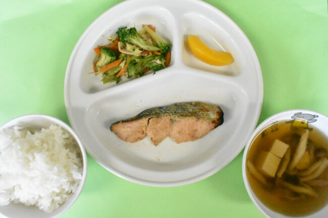~今日の給食~ ・鮭の西京焼き ・ブロッコリーとハムのサラダ ・ごはん ・高野豆腐としめじのすまし汁 ・もも ~今日のおやつ~ ・牛乳 ・パンケーキ
