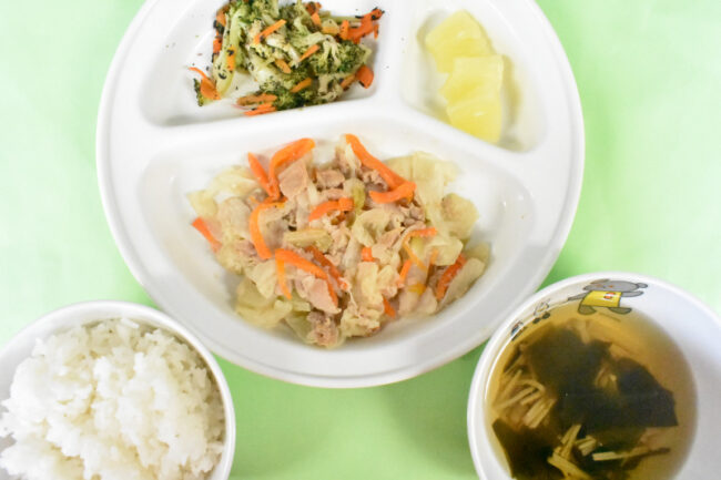~今日の給食~ ・豚肉とキャベツのみそ炒め ・ブロッコリーと人参のゆかり和え ・ごはん ・わかめとしめじのすまし汁 ・パイン ~今日のおやつ~ ・牛乳 ・マカロニきな粉