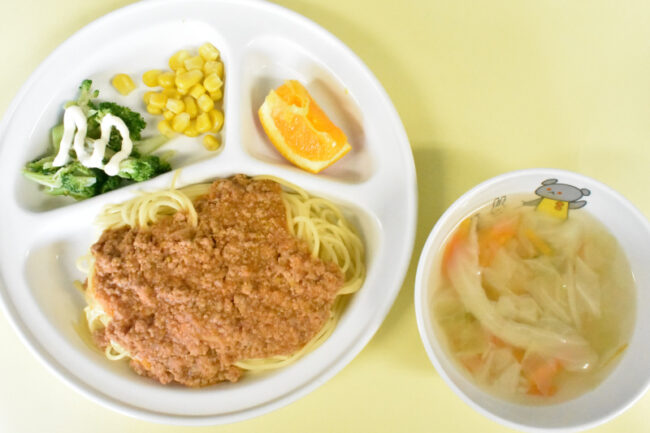 ~今日の給食~ ・ミートスパゲティー ・ボイルブロッコリー ・コーンバター ・野菜のスープ ・オレンジ ~今日のおやつ~ ・牛乳 ・わかめおにぎり