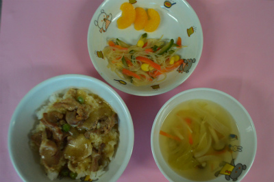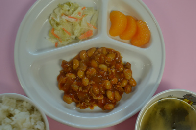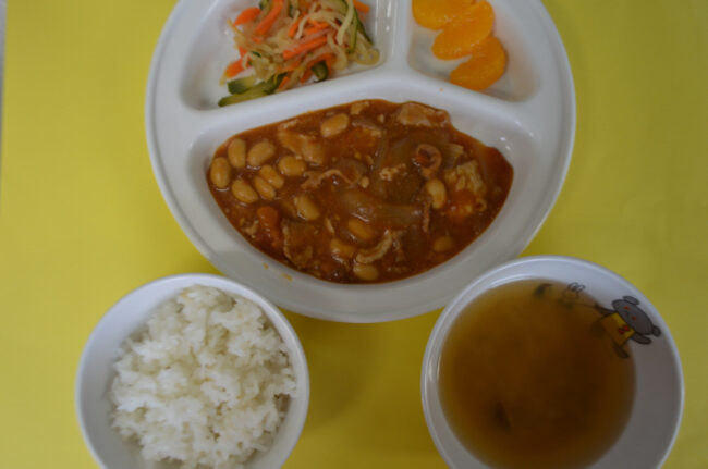~ 今日の給食 ~ ・ポークビーンズ ・切り干し大根のサラダ ・ごはん ・しめじと油揚げのみそ汁 ・みかん ~ 今日のおやつ ~ ・牛乳 ・にんじんパンケーキ