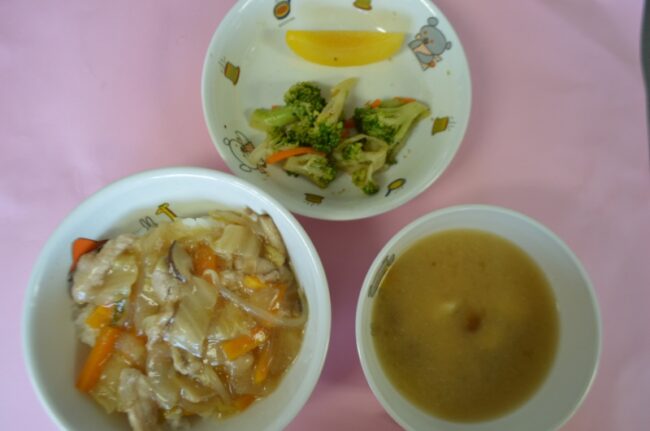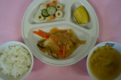 ~ 今日の給食 ~ ・白身魚の野菜あんかけ ・ブロッコリーと人参のごまあえ ・ごはん ・豆腐となめこのみそ汁 ・もも ~ 今日のおやつ ~ ・牛乳 ・彩りそうめん