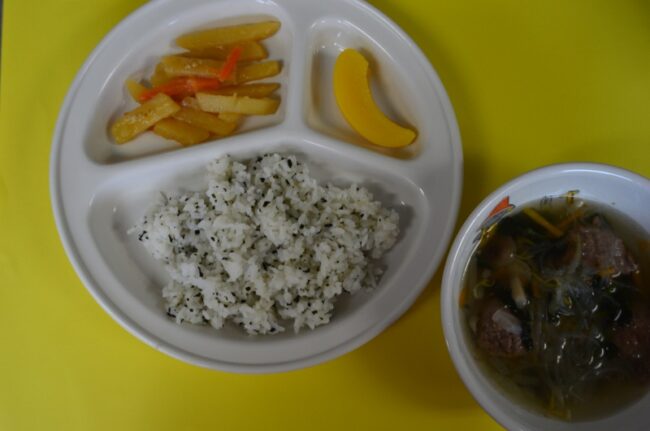~ 今日の給食 ~ ・厚揚げの野菜あんかけ ・キャベツの昆布和え ・ごはん ・さつまいもと玉ねぎのみそ汁 ・もも ~ 今日のおやつ ~ ・牛乳 ・チヂミ