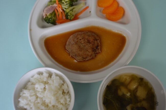 ~今日の給食~ ・ハンバーグ ・ブロッコリーとハムのサラダ ・ごはん ・ほうれん草と油揚げのみそ汁 ・みかん ~今日のおやつ~ ・麦茶 ・お誕生日ケーキ