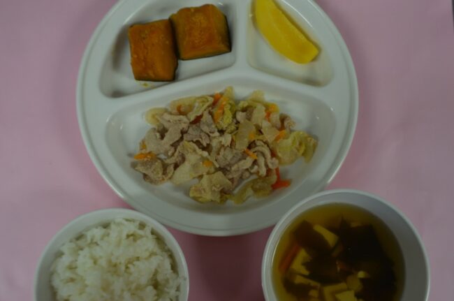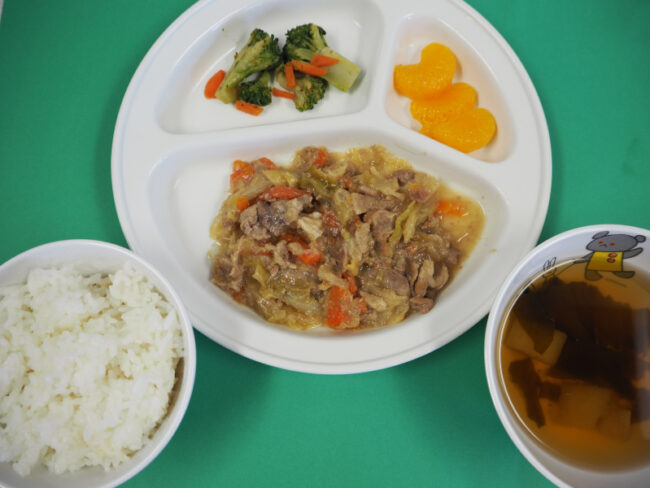 ~ 今日の給食 ~ ・豚肉とキャベツのみそ炒め ・ブロッコリーのおかか和え ・ごはん ・ほうれん草とえのきのすまし汁 ・みかん ~ 今日のおやつ ~ ・牛乳 ・ドーナツ