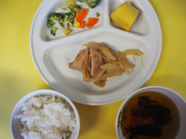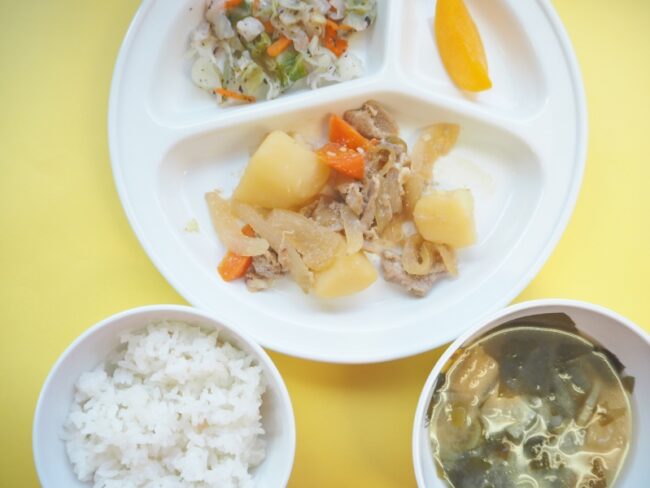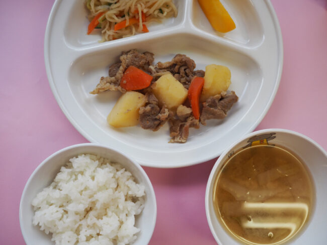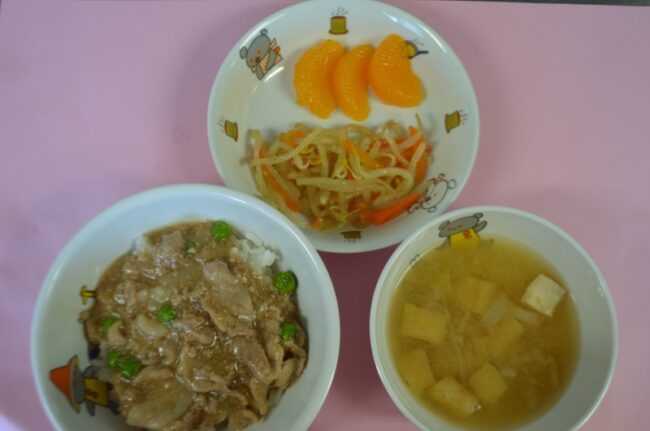 ~ 今日の給食 ~ ・じゃがいものそぼろ煮 ・キャベツのゆかり和え ・ごはん ・さつまいもとたまねぎのみそ汁 ・もも ~ 今日のおやつ ~ ・麦茶 ・牛乳もち
