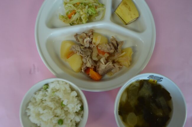 ~今日の給食~ ・肉じゃが ・キャベツと人参のおかかあえ ・グリンピースごはん ・お麩とわかめのみそ汁 ・バナナ ~今日のおやつ~ ・かぼちゃもち