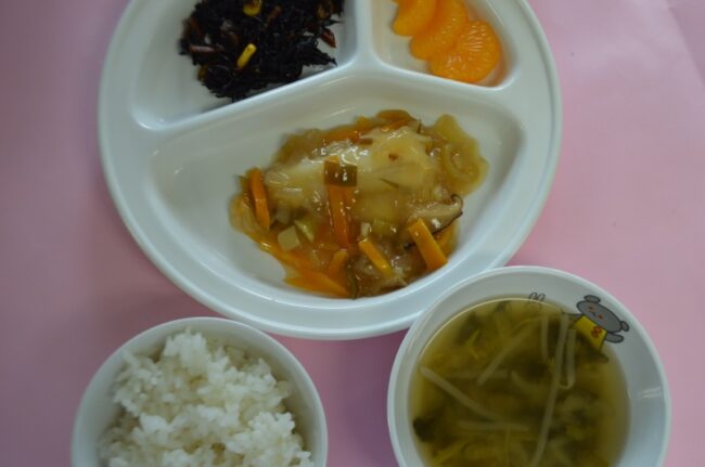 ~今日の給食~ ・白身魚の野菜あんかけ ・ひじき煮 ・ごはん ・ほうれん草ともやしのみそ汁 ・みかん ~今日の給食~ ・ビスケット ・ミニゼリー