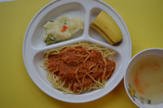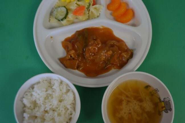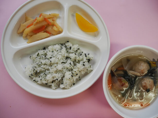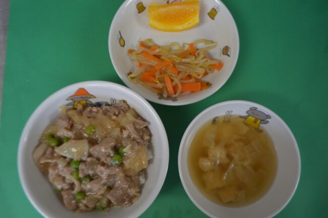 ~ 今日の給食 ~ ・なすのひき肉あんかけ ・切り干し大根のカミカミサラダ ・ごはん ・もやしと小松菜のみそ汁 ・もも ~ 今日のおやつ ~ ・牛乳 ・にんじんパンケーキ