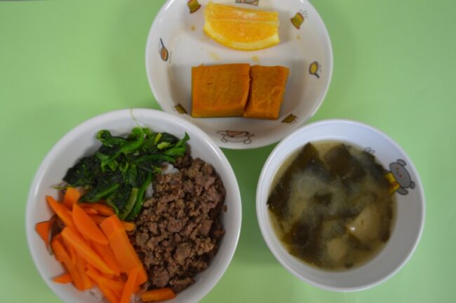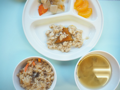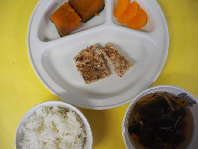 ~ 今日の給食 ~ ・きのこの炊き込みごはん ・かぼちゃのそぼろあんかけ ・高野豆腐と野菜の含め煮 ・もやしとほうれん草のみそ汁 ・みかん ~ 今日のおやつ ~ ・牛乳 ・チヂミ