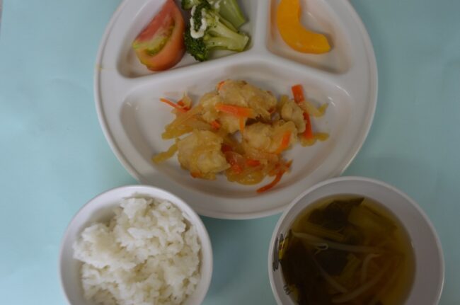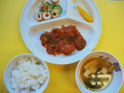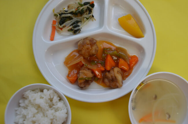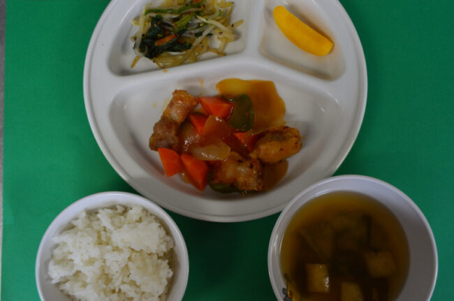 ~ 今日の給食 ~ ・酢豚 ・三色ナムル ・ごはん ・小松菜と油揚げのみそ汁 ・もも ~ 今日のおやつ ~ ・牛乳 ・ミニゼリー ・ビスケット