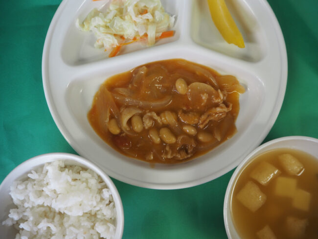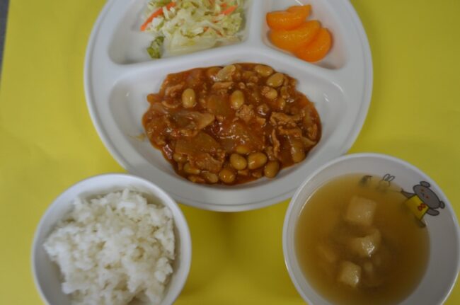 ~ 今日の給食 ~ ・ポークビーンズ ・コールスローサラダ ・ごはん ・豆腐と油揚げのみそ汁 ・もも ~ 今日のおやつ ~ ・牛乳 ・ポテトフライ