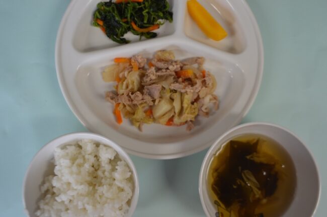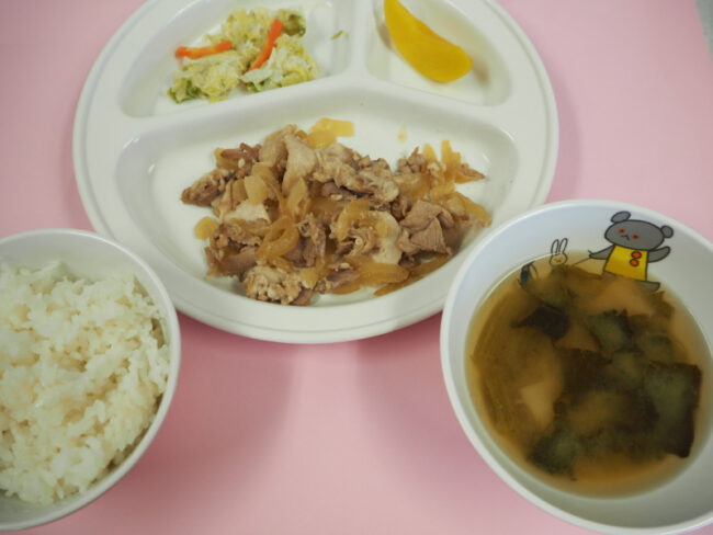 ~今日の給食~ ・豚肉とキャベツのみそ炒め ・ほうれん草のおかかあえ ・ごはん ・わかめとえのきのすまし汁 ・もも ~今日のおやつ~ ・牛乳 ・お好み焼き