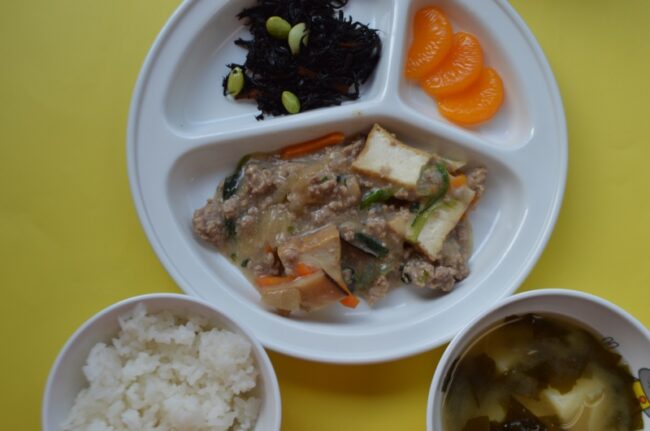 ~今日の給食~ ・厚揚げの野菜あんかけ ・ひじき煮 ・ごはん ・じゃがいもと玉ねぎのみそ汁 ・みかん ~今日のおやつ~ ・牛乳 ・ビスケット ・ミニゼリー