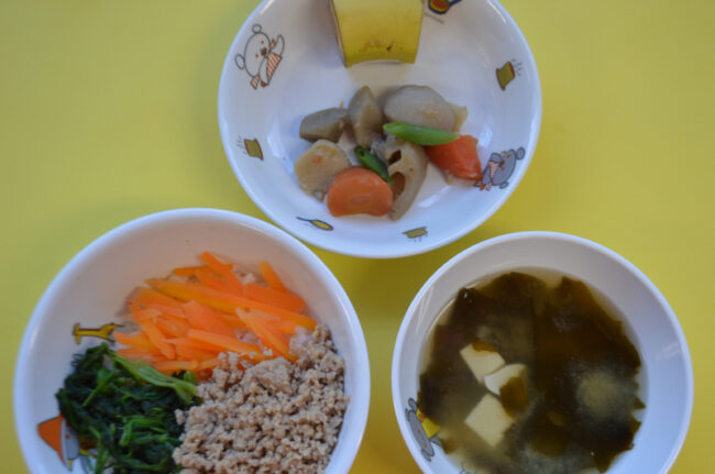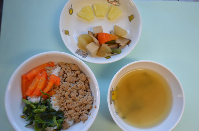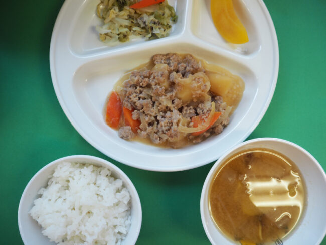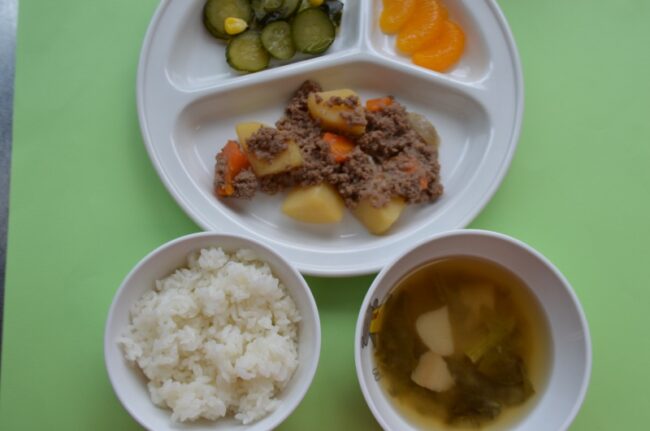 ~今日の給食~ ・じゃがいものそぼろあんかけ ・きゅうりの酢の物 ・ごはん ・お麩とほうれん草のみそ汁 ・みかん ~今日のおやつ~ ・牛乳 ・スコーン