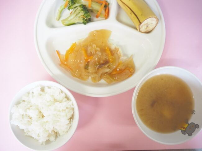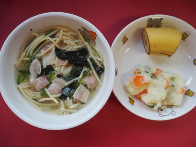 ~ 今日の給食 ~ ・白身魚のあんかけ ・ちくわときゅうりのあえもの ・ごはん ・えのきとわかめのみそ汁 ・バナナ ~ 今日のおやつ ~ ・牛乳 ・にゅうめん