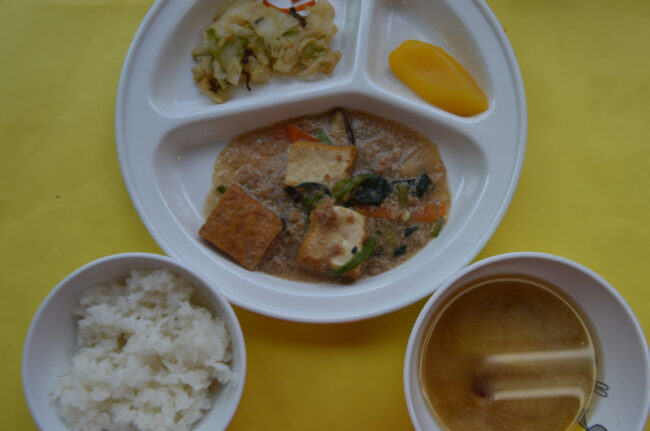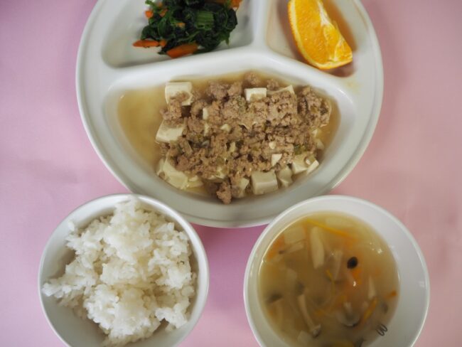 ~ 今日の給食 ~ ・豆腐のひき肉あんかけ ・ツナサラダ ・ごはん ・じゃがいもとたまねぎのみそ汁 ・もも ~ 今日のおやつ ~ ・麦茶 ・牛乳もち