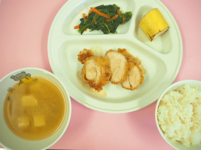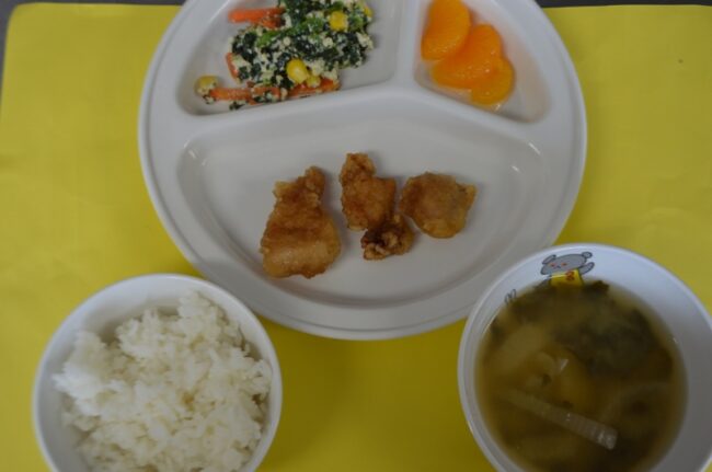 ~今日の給食~ ・鶏のから揚げ ・ほうれん草の白和え ・ごはん ・じゃがいもと玉ねぎのみそ汁 ・みかん ~今日のおやつ~ ・麦茶 ・牛乳プリン ・鉄ウエハース