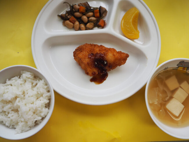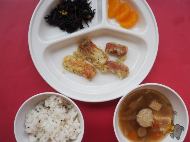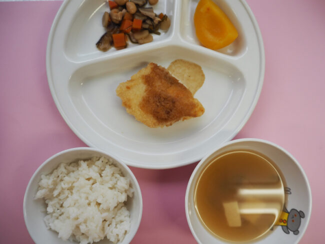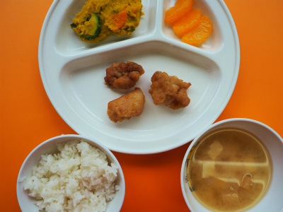 ~ 今日の給食 ~ ・鶏のから揚げ ・切り干し大根のサラダ ・ごはん ・キャベツと油揚げのみそ汁 ・みかん ~ 今日のおやつ ~ ・牛乳 ・りんごゼリー ・鉄ウエハース