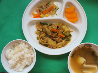 ~ 今日の給食 ~ ・カレー風肉野菜炒め ・春雨サラダ ・ごはん ・じゃがいもと玉ねぎのみそ汁 ・みかん ~ 今日のおやつ ~ ・牛乳 ・マカロニきな粉