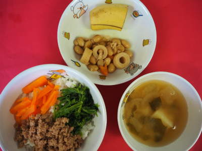 ~ 今日の給食 ~ ・三色丼 ・ちくわと豆煮 ・じゃがいもと玉ねぎのみそ汁 ・バナナ ~ 今日のおやつ ~ ・麦茶 ・牛乳プリン ・鉄ウエハース