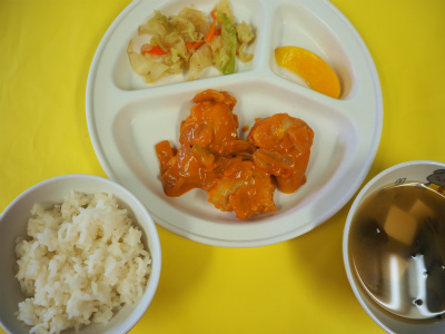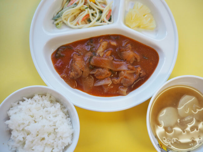 ~今日の給食~ ・鶏肉のトマト煮 ・切り干し大根のカミカミサラダ ・ごはん ・お麩とほうれん草のみそ汁 ・みかん ~今日のおやつ~ ・牛乳 ・ポテトフライ