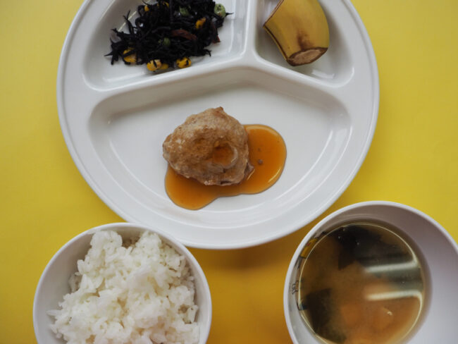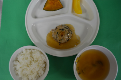 ~ 今日の給食 ~ ・ひじきの和風ハンバーグ ・かぼちゃの煮つけ ・ごはん ・キャベツとしめじのみそ汁 ・もも ~ 今日のおやつ ~ ・牛乳 ・にんじん蒸しパン