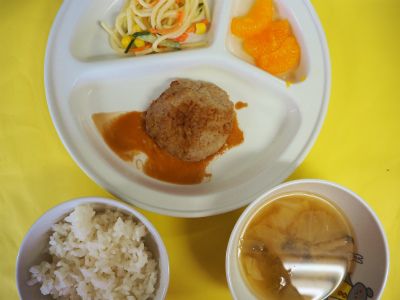 ~今日の給食~ ・切り干し大根のハンバーグ ・マカロニサラダ ・ごはん ・高野豆腐としめじのみそ汁 ・みかん ~今日のおやつ~ ・牛乳 ・イチゴジャム蒸しパン