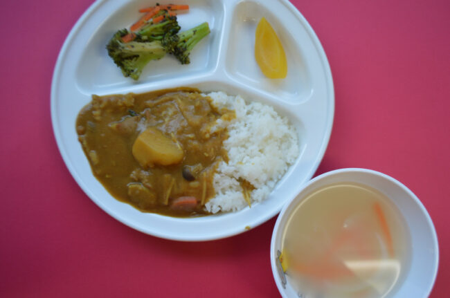 ~ 今日の給食 ~ ・きのこ入りカレーライス ・ブロッコリーと人参のゆかり和え ・春雨スープ ・もも ~ 今日のおやつ ~ ・牛乳 ・スコーン