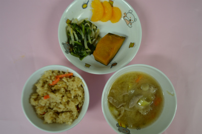 ~ 今日の給食 ~ ・炊き込みごはん ・かぼちゃの煮つけ ・ほうれん草の煮浸し ・豚汁 ・みかん ~ 今日のおやつ ~ ・牛乳 ・きな粉ドーナツ