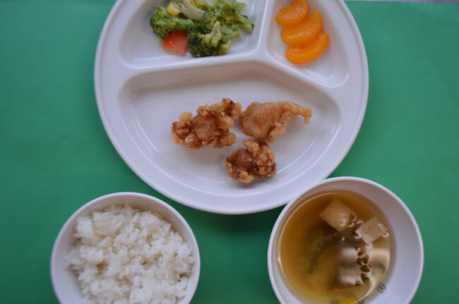 ~ 今日の給食 ~ ・鶏のから揚げ ・ブロッコリーとコーンのサラダ ・ごはん ・小松菜と油揚げのみそ汁 ・みかん ~ 今日のおやつ ~ ・牛乳 ・にんじん蒸しパン