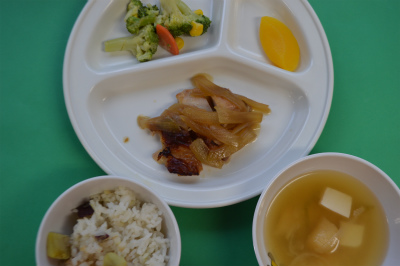 ~ 今日の給食 ~ ・松かさ焼き ・かぼちゃの煮つけ ・ごはん ・えのきとわかめのすまし汁 ・みかん ~ 今日のおやつ ~ ・麦茶 ・お誕生日ケーキ