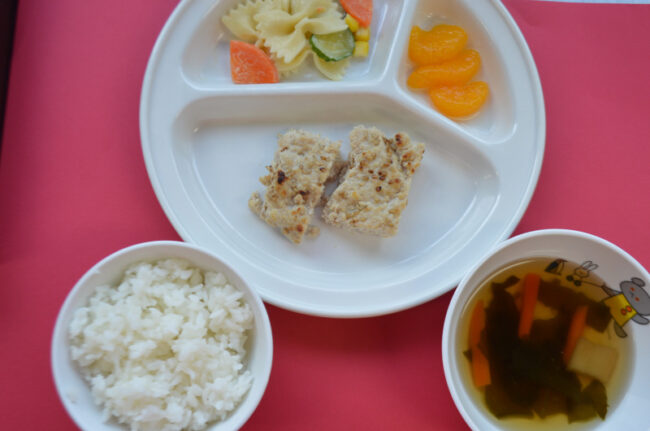 ~ 今日の給食 ~ ・ハンバーグ ・スパゲティーサラダ ・ごはん ・キャベツとしめじのみそ汁 ・みかん ~ 今日のおやつ ~ ・牛乳 ・野菜ドーナツ